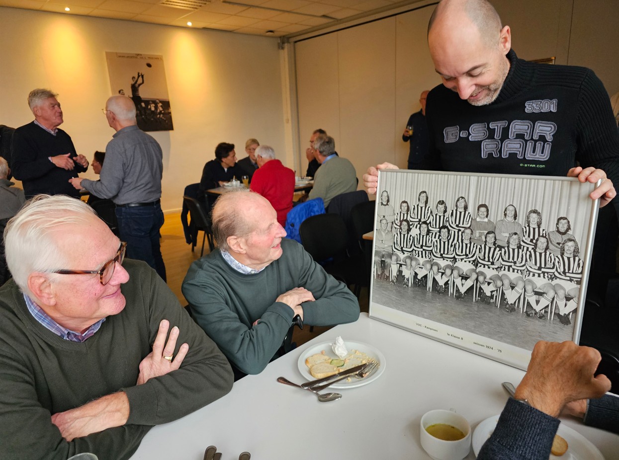 De oudste Hsv VUC 1 speler Tom de Graef (83 jaar) bekijkt hier de kampioensfoto uit seizoen 1974-1975