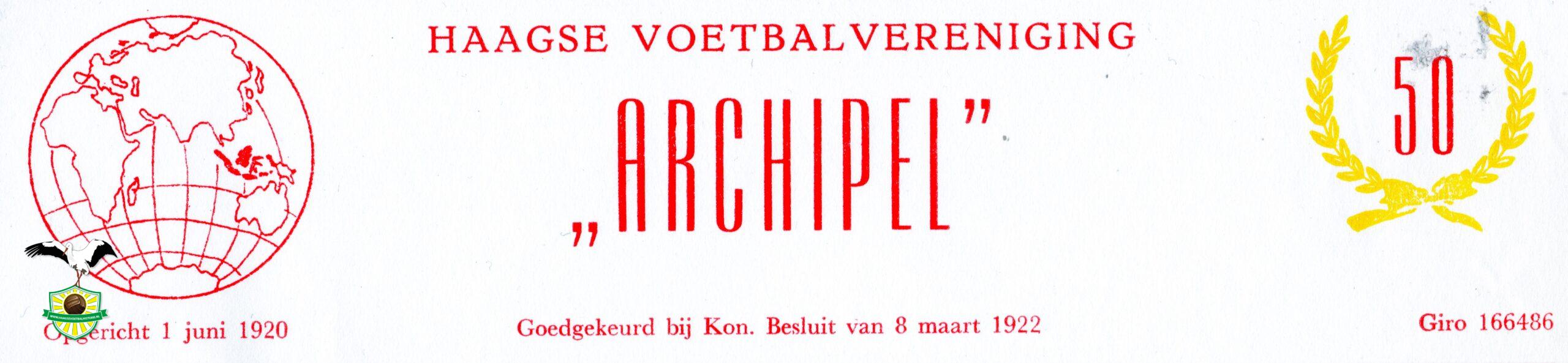 De HVV Archipel werd op 1 juni 1920 opgericht. De naam is afgeleid van de Haagse Archipelbuurt, alwaar de straten, – zoals de Bankastraat -, de namen dragen van eilanden van de Indonesische Archipel. De grens van Den Haag hield op ter hoogte van de Raamweg en aan de overkant van het water (te bereiken via een pontje) was er gelegenheid tot het spelen van voetbal. Op initiatief van o.a. Chris Driehuijs werd onderling besloten de voetbalclub Archipel op te richten. Veel bewoners uit de buurt kwamen samen in café “Archipel” in de Bankastraat te Den Haag en dronken er vaak een biertje. Eigenaar van het café was Jan Borsboom. Het verhaal gaat dat daar het idee is ontstaan de voetbalvereniging Archipel op te richten. In die tijd werd Indonesië, Nederlands Indië genoemd, toen nog een overzees gebiedsdeel (lees: kolonie) van Nederland. Voor de clubkleuren werd uit rood en wit gekozen. Het Archipel tenue bestond dus officieel uit een wit shirt met een rode kraag en rode manchetten, een rode broek en rode kousen met een wit boord.