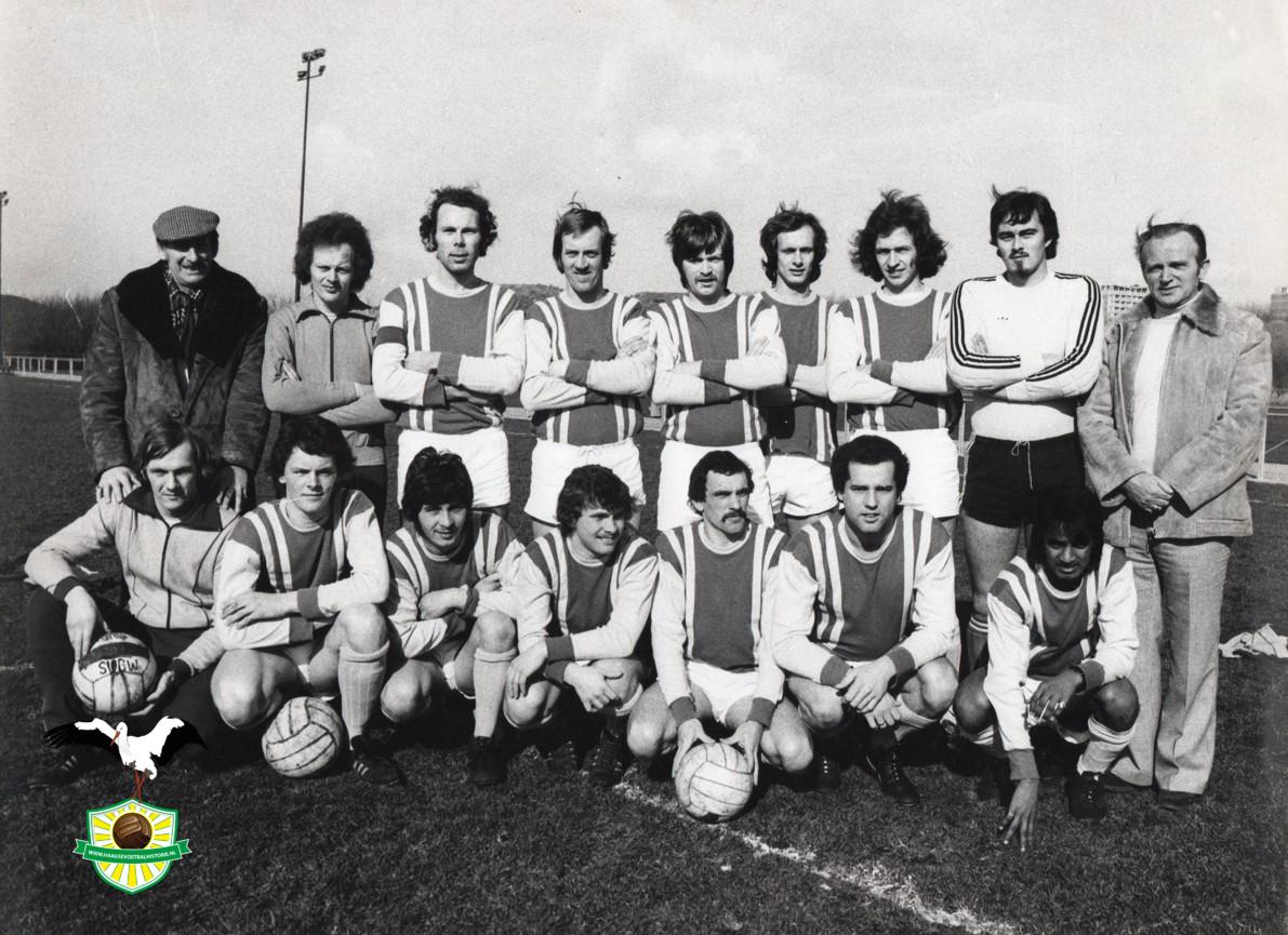 SVGW 1 seizoen 1976-1977 Zaterdag Hoofdklasse HVB. Staand v.l.n.r; Valk,..Bruinewoud, T Dijkman, P. van Tilburg, John van der Zwan, W Valk, L Dekker, W Akse, B Thielen. Gehurkt v.l.n.r;  T. Planken, R. Bruinewoud,…van Kesteren, M. Buis, A. Buis, J Bernard, en nn.