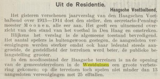 Onderweg naar huis kwam ik op het idee om nader uit te zoeken hoe het circa honderd jaar geleden met de bezettingsgraad van de Haagse voetbalvelden gesteld was – hoe heeft e.e.a. zich de afgelopen eeuw ontwikkeld. Vanuit al mijn beschreven columns wist ik best wel te benoemen dat er door de decennia heen een flink aantal uitbreidingsprojecten inzake het vanuit de Gemeente Den haag beschikbaar stellen van voetballocaties is afgerond. Dat de gemeentelijke overheid aanvankelijk – in de beginjaren van het voetbal – niets zag in trappen tegen een bal, waarvoor dan ook nog velden beschikbaar moesten worden gesteld, was mij tevens duidelijk. Als er al velden werden aangelegd, was men er nooit zeker van dat zij na verloop van tijd niet zouden verdwijnen. Zoals de tien velden die in 1912 beschikbaar waren in of aan de Westduinen – waar in 1915 dertien verenigingen speelden en men vanaf 1925 vanwege woningbouw – stadsuitbreiding dus – mocht vertrekken.