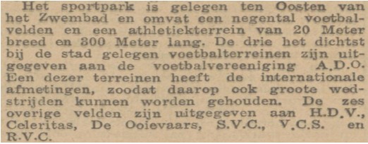 Overigens wist ik van het bestaan van deze velden tot vandaag niets af! Ook ADO heeft daar dus gespeeld – weer wat geleerd. Mijn nadere zoektocht leerde mij dat tevens o.a. UNI, VUC, TOGO, NCS, HDV, SVC, ESDO, Quick, Celeritas, VVP, GEB, VDS en BMT in de Westduinen – een best wel omvangrijk gebied – hebben gespeeld. ADO speelde in vak I, UNI in vak G, VUC in vak C. Ik heb het vermoeden dat met ‘vak’ in dit geval het gebied waar betreffende vereniging speelde werd aangeduid. Quick speelde in ieder geval op oud Hanenburg, wellicht vak Q? Ik weet het niet.