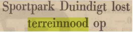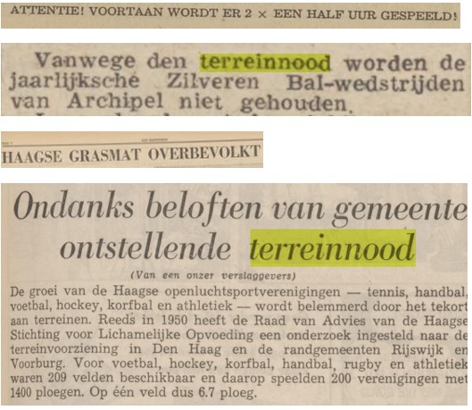 Aan het begin van de jaren vijftig was de terreinnood alles behalve opgelost – de aanwas van voetballers was groot. In 1952 was er dringend behoefte aan 140 extra Haagse voetbalvelden. Van GDA – dat over 1 veld beschikte – moest noodgedwongen de complete jeugdafdeling en een flink aantal seniorenelftallen naar Ockenburgh uitwijken. Het bleef behelpen. Onder druk van diverse belangenverenigingen en de HVB – die een gezamenlijk protest inzake de terreinnood hadden opgesteld – kon men binnen de gemeentelijke burelen niet anders doen dan daadwerkelijk overgaan tot het samenstellen van een tienjarenplan. Natuurlijk werden diverse clubs geplaatst: BMT, VCS, LenS, VIOS, Spoorwijk en Die Haghe in Escamp. In 1959 GONA en HMSH aan de Vrederustlaan/Beresteinlaan, in 1960 CWP aan de Muurbloemweg, in 1964 RAS, ODB en Duindorp sv aan Albardastraat – allen nieuwe terreinen. Vanaf het begin van de jaren vijftig werd het aantal voetbalvelden aan de Buurtweg aanzienlijk uitgebreid. In Rijswijk, Voorburg en Delft werd in de jaren vijftig flink aan de weg getimmerd. Wat te denken van de veelheid aan voetbalvelden aan de Brasserskade te Delft, de voetbalvelden op het Prinses Irenepark in Rijswijk en de nieuwe DEVJO-velden aan de Prins Bernardlaan te Voorburg.
