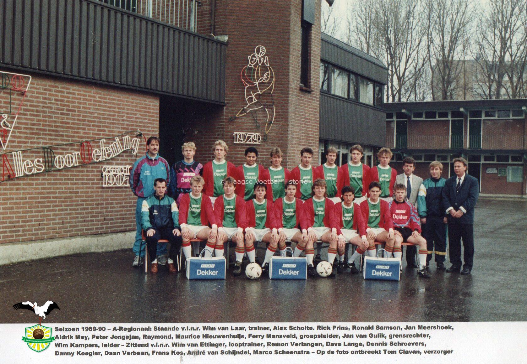 Jan Meershoek (achterste rij 3e van rechts) met Hsv ADO A-regionaal al op zaterdag 24 februari 1990 kampioen van de Hoofdklasse