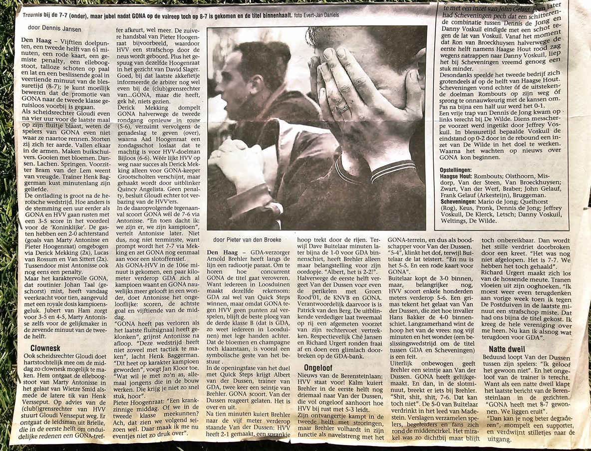 Redactie HVH; Marty Antonisse zal (denken wij) altijd herinnerd worden aan zondag 28 april 2002 met de wedstrijd GONA – HVV. In 2020 was dit al het geval in de AD/Haagsche Courant en nu in 2026 hebben wij het hier op onze website het er weer over. Mooi dat de voetballer en wij deze historische wedstrijd weer met al onze Haagse voetbalhistorie liefhebbers kunnen en mogen delen! Bedankt hiervoor Marty Antonisse.