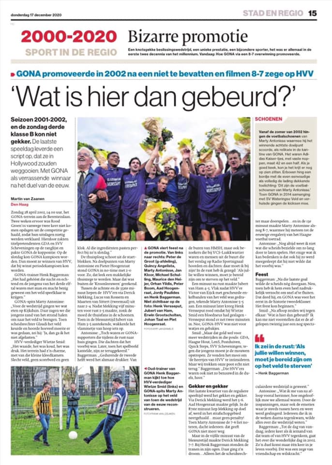 Redactie HVH; Marty Antonisse zal (denken wij) altijd herinnerd worden aan zondag 28 april 2002 met de wedstrijd GONA – HVV. In 2020 was dit al het geval in de AD/Haagsche Courant en nu in 2026 hebben wij het hier op onze website het er weer over. Mooi dat de voetballer en wij deze historische wedstrijd weer met al onze Haagse voetbalhistorie liefhebbers kunnen en mogen delen! Bedankt hiervoor Marty Antonisse.