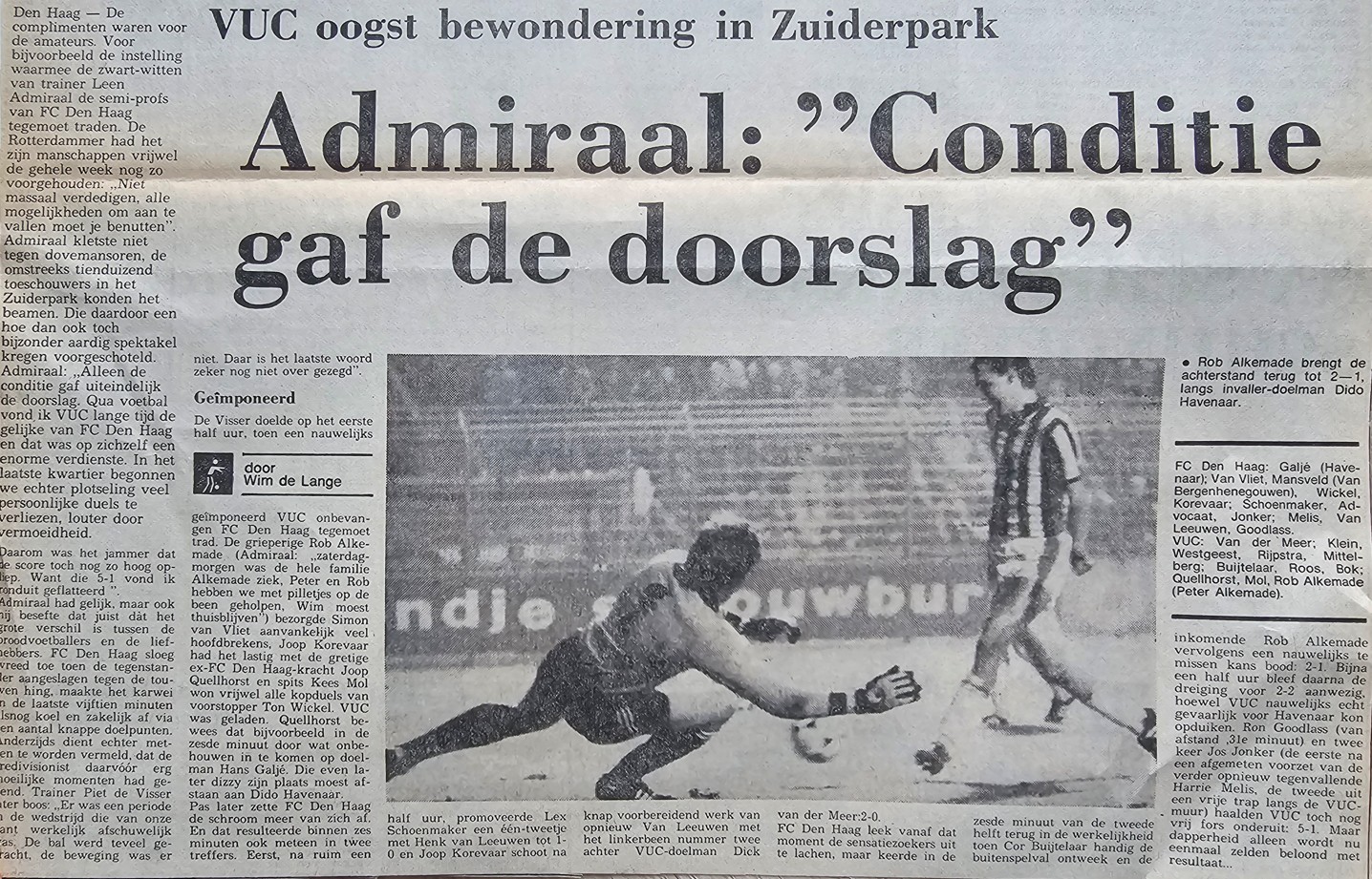 RVC – VUC 1-3. En ik scoorde twee keer. Van oorsprong komt mijn familie uit Rijswijk. Mijn vader liep dan al een uur voor de wedstrijd langs het veld. En iedereen sprak hem aan. Soms vergiste mensen zich want mijn vader is er een van een tweeling. Dan zeiden he Koos, maar hij heette Wim. Zij hebben ook nog allebei bij Wilhelmus in het 1e gevoetbald. Na de wedstrijd zat hij trots in de kantine. En werd hij een beetje lastig gevallen door een beschonken man die hem constant Koos noemde. Voor de laatste keer zij hij tegen die man. Sodemieter op ik ben Wim, Ik ben Koos niet. Op dat moment loop ik naar hem toe en zeg KOOS BIERTJE. Dat gezicht van hem.