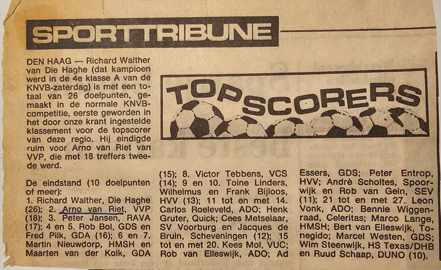 In het plakboek van Arno van Riet vonden nog de eindstand van de topscorerslijst van seizoen 1982-1983. Wat een prachtige namen (en clubs) allemaal nog! Kijk en geniet vooral mee met deze lijst.
