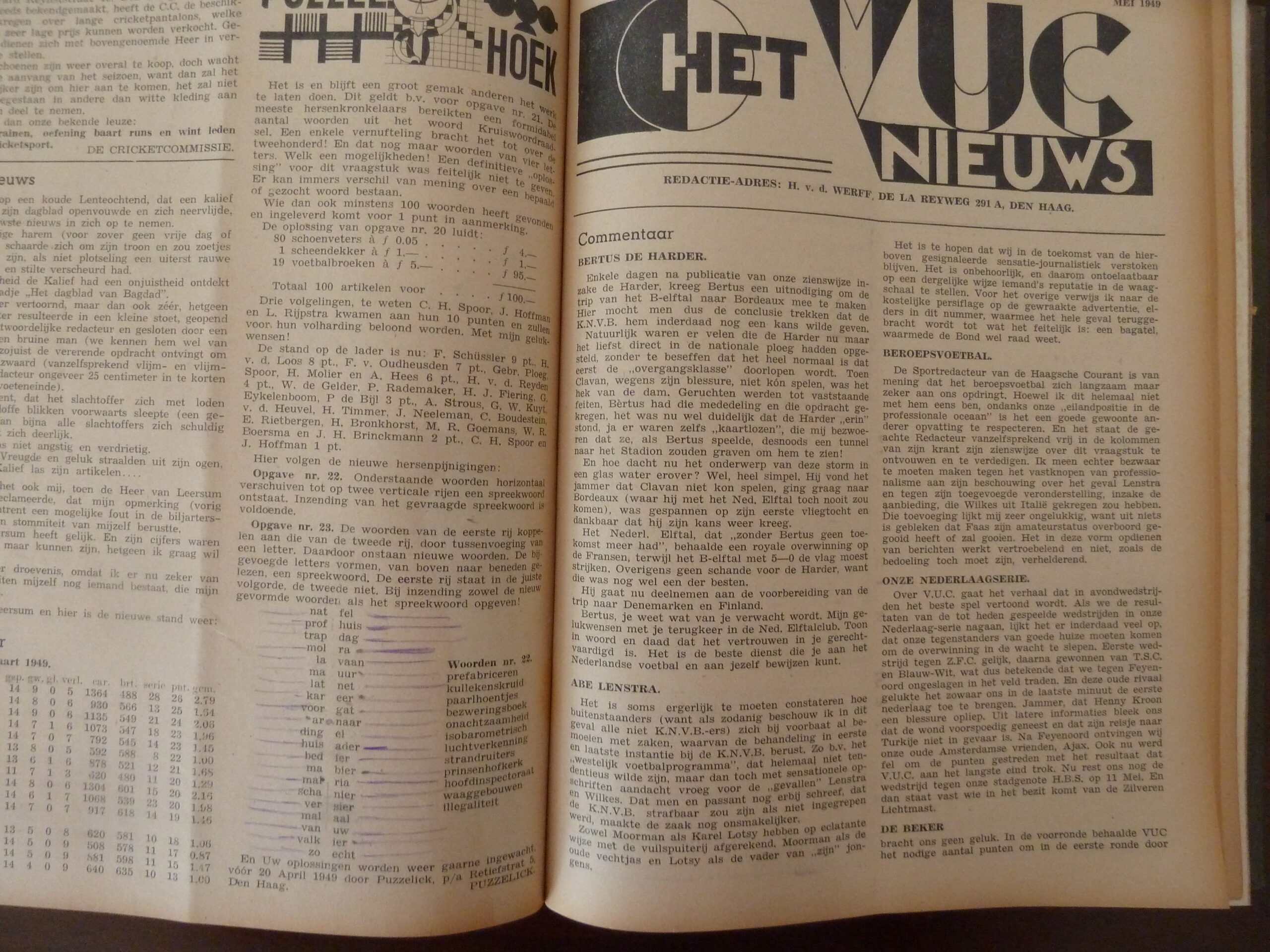 Al vele jaren heb ik een “VUC-Nieuws” boek in de kast staan. Het was van m’n vader die ze leven lang VUC-lid is geweest. Het betreft ingebonden VUC-Nieuwsbladen vanaf februari 1946 t/m december 1951. Clubnieuws, ingezonden verhalen van de leden en natuurlijk de wekelijkse opstellingen. Zo las ik in september 1947 de opstelling van het 1e elftal met Joop de Kubber en twee spelers die de Harder heten. En in het 2e elftal nog een derde de Harder.