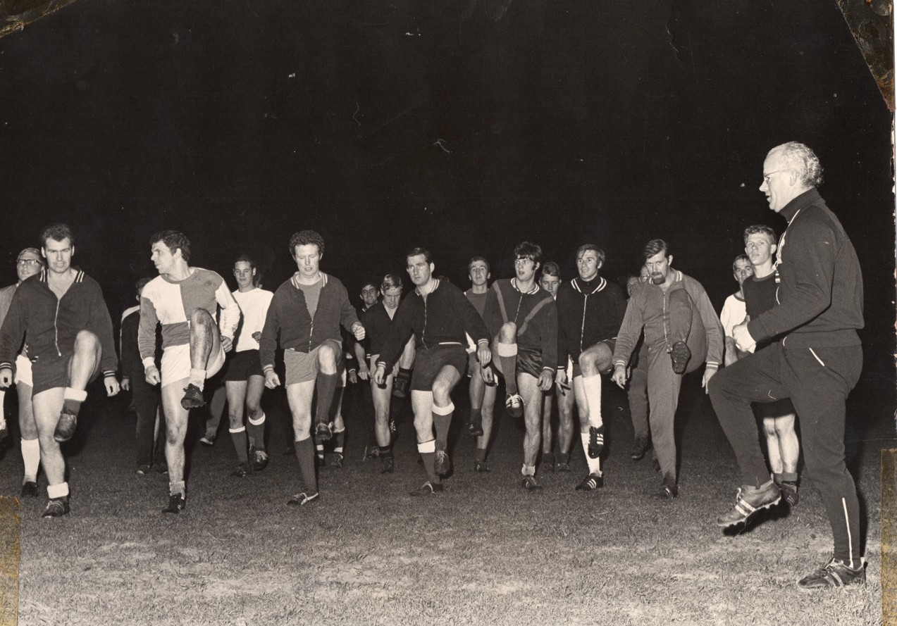Trainer Jan Mars (geheel rechts) verzorgd in seizoen 1967-1968 in zijn eentje de gehele training van de A-selectie van Cromvliet