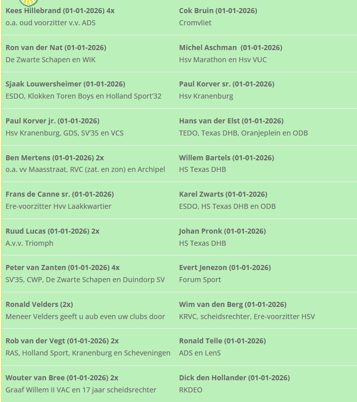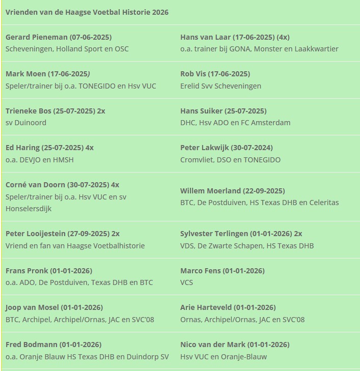 Als vriend van Stichting de Haagse Voetbal Historie wordt uw naam en uw (voormalige) club(s) tot minimaal eind 2026 vermeld op onze website. Als dank voor uw steun komt uw naam (met club) ook te staan in ons nieuwe boek die we gaan uitgeven in het jaar 2026.